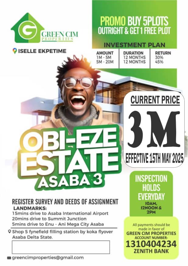DownloadsExplore our resources and materials available for download. Flyers Subscription Forms Survey Document All Consultants Ember Month Sales Promo Join Our Consultants Adunke Gardens and Park Estate Phase 1 Subscription Forms Obi-Eze Estate Asaba Phase 3 Survey Document Obi-Eze Estate Phase 3 Flyers Obi-Eze Estate Asaba Phase 3 Subscription Forms